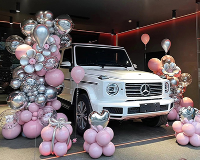 定制化白色大G提车仪式,采用粉色与银色气球装饰,打造时尚与奢华兼备的气氛。让您的奔驰G级提车仪式充满高端氛围与典雅美感。