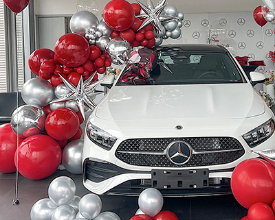 白色奔驰提车仪式,以红色和银色气球布置为主题,打造豪华与高端的交付体验,彰显奔驰的品牌价值与精致感。