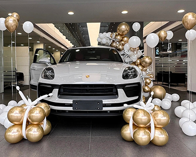 专业Macan金色气球布置案例展示,为您的高端派对或车展增添奢华气氛。精美的气球布置设计与豪华保时捷Macan完美融合,提升活动的档次感