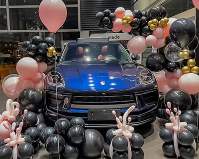 定制化蓝色Macan提车仪式气球布置,结合黑色、粉色与金色气球设计,为豪车交付典礼增添高贵优雅氛围。通过独特气球布置,打造专属提车仪式。
