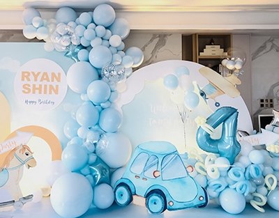 浅浅的淡蓝色气球搭配白色气球和五角星铝箔透明银色亮片宝宝四周岁场景布置